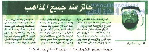 » الدكتور ÙŠÙˆØ³Ù Ø§Ù„Ø´Ø±Ø§Ø ÙŠØ¤ÙƒØ¯ جواز الزواج بنية الطلاق