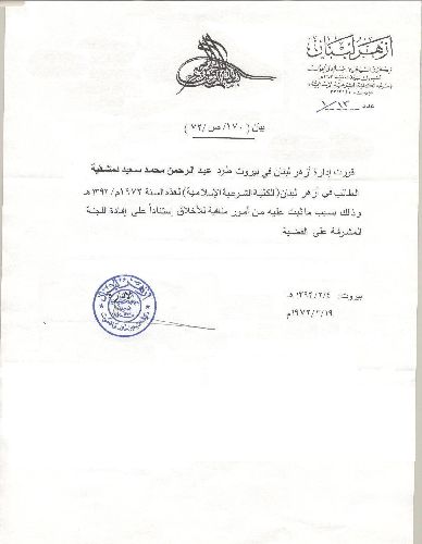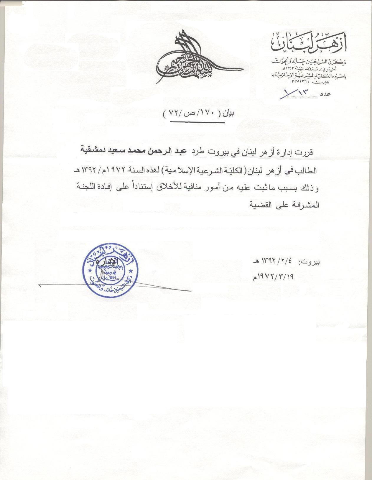 وثيقة تثبت طرد الدمشقية من الأزهر بعد ما ثبتت عليه أمور مناÙية للأخلاق !!