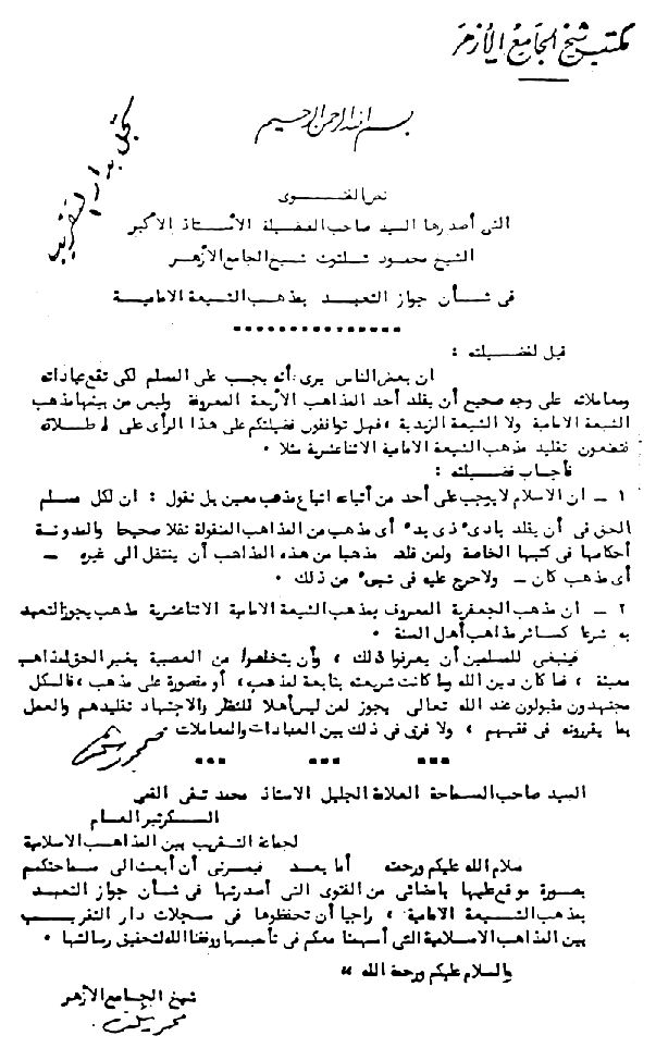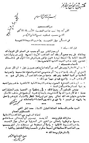 صورة ÙØªÙˆÙ‰ الأزهر بجواز التعبد بالمذهب الشيعي
